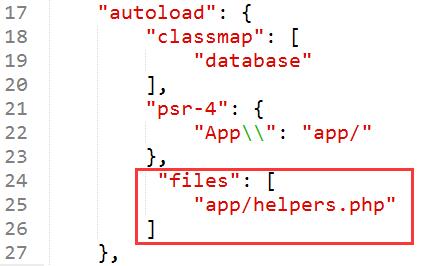 2. 在composer.json文件中的 autoload下增加 "files": ["app/helpers.php"];
