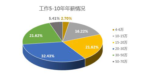 在工作5-10 年后年收入在 15-20 萬的程序員占 21.62%,1/3 的程序員年收入在 20-30 萬之間,超過1/5 的程序員年收入在 30-50 萬之間。年收入在 50-70 萬的程序員占 5.41%。
