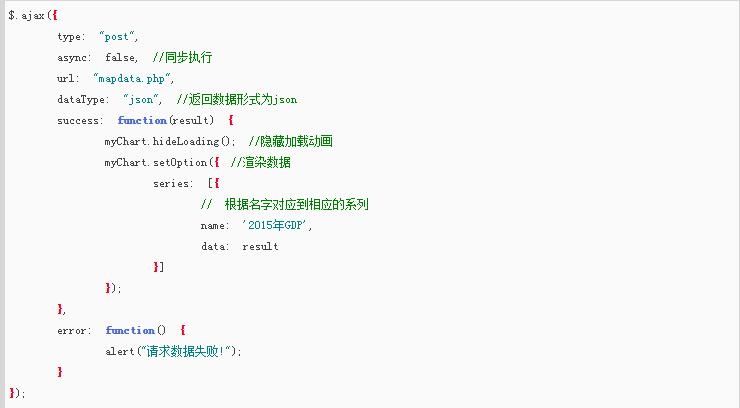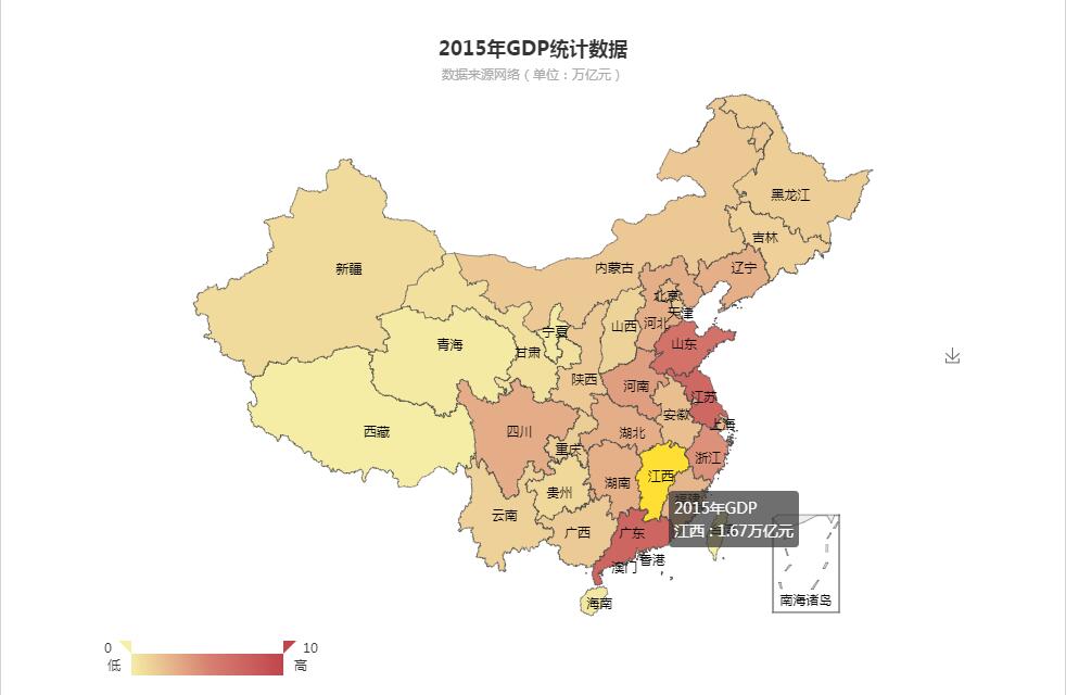 我們以中國地圖為例,展示去年(2015年)我國各省份GDP數(shù)據(jù)。通過異步請求php,讀取mysql中的數(shù)據(jù),然后展示在地圖上。