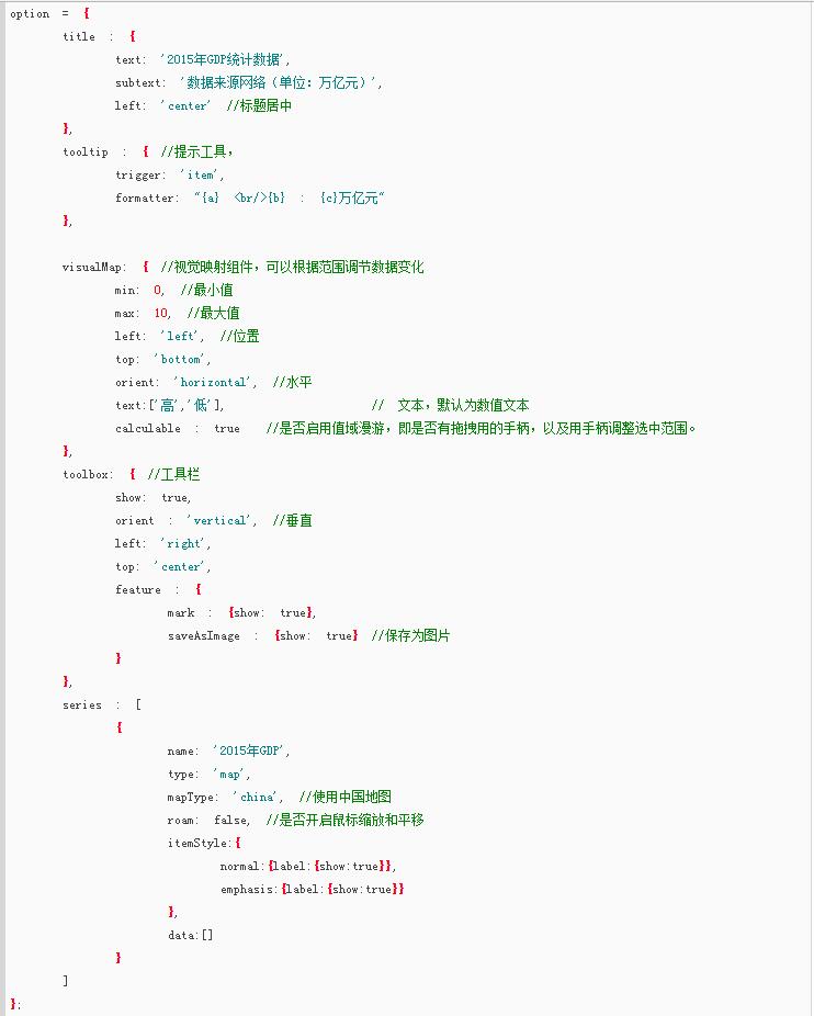接下來js部分,先設(shè)置好Echarts選項內(nèi)容,請看以下代碼及注釋。