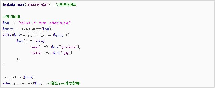 mapdata.php的任務(wù)是讀取mysql數(shù)據(jù)表中的數(shù)據(jù),然后返回給前端。首先是要連接數(shù)據(jù)庫,這部分代碼在connect.php中,請下載源碼查看。然后就是sql查詢,讀取表echarts_map中的數(shù)據(jù),最后以json格式返回。