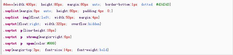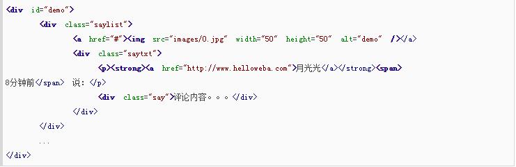 上述HTML結(jié)構(gòu)由N個.saylist構(gòu)成,用于展示用戶的評論信息,當(dāng)然在本例中,將由PHP負責(zé)生成這段XHTML代碼。
