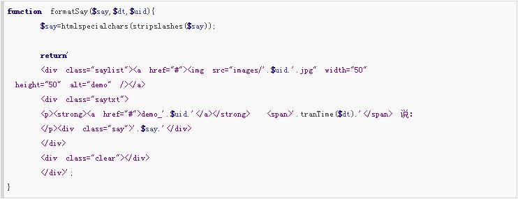 在function.php中有兩個函數(shù),formatSay()用來輸出用戶評論列表,即輸出上文中的HTML。