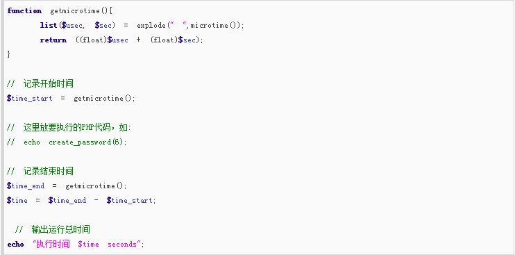 我們使用以下PHP代碼,計(jì)算上面的 3 個(gè)隨機(jī)密碼生成函數(shù)生成 6 位密碼的運(yùn)行時(shí)間,進(jìn)而對(duì)他們的時(shí)間效率進(jìn)行一個(gè)簡(jiǎn)單的對(duì)比。