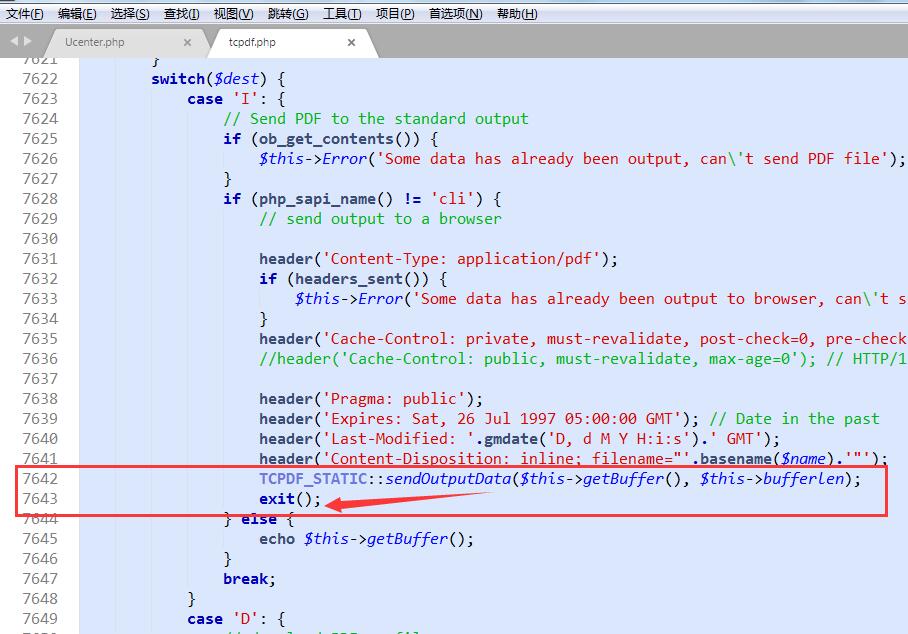 打開tcpdf.php文件, 第7643行, 增加 die() 或者 exit() 語句
