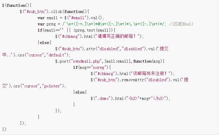 當(dāng)用戶輸入完郵箱并點(diǎn)擊提交后,jQuery先驗(yàn)證郵箱格式是否正確,如果正確則通過(guò)向后臺(tái)sendmail.php發(fā)送Ajax請(qǐng)求,sendmail.php負(fù)責(zé)驗(yàn)證郵箱是否存在和發(fā)送郵件,并會(huì)返回相應(yīng)的處理結(jié)果給前臺(tái)頁(yè)面,請(qǐng)看jQuery代碼: