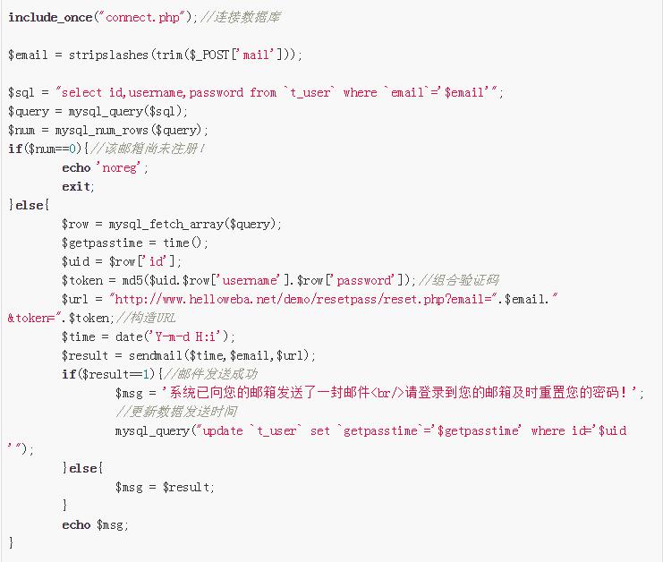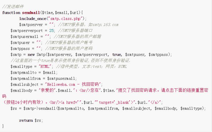 sendmail.php需要驗(yàn)證Email是否存在系統(tǒng)用戶表中,如果有,則讀取用戶信息,將用戶id、用戶名和密碼驚醒md5加密生成一個(gè)特別的字符串作為找回密碼的驗(yàn)證碼,然后構(gòu)造URL。同時(shí)我們?yōu)榱丝刂芔RL鏈接的時(shí)效性,將記錄用戶提交找回密碼動(dòng)作的操作時(shí)間,最后調(diào)用郵件發(fā)送類發(fā)送郵件到用戶郵箱,發(fā)送郵件類smtp.class.php已經(jīng)打包好,請(qǐng)下載。