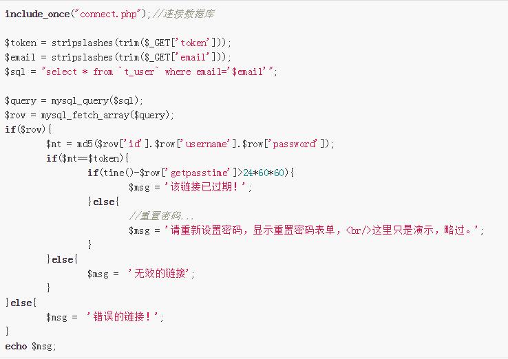 reset.php首先接受參數(shù)email和token,然后根據(jù)email查詢數(shù)據(jù)表t_user中是否存在該Email,如果存在則獲取該用戶的信息,并且和sendmail.php中的token組合方式一樣構(gòu)建token值,然后與url傳過(guò)來(lái)的token進(jìn)行對(duì)比,如果當(dāng)前時(shí)間與發(fā)送郵件時(shí)的時(shí)間相差超過(guò)24小時(shí)的,則提示“該鏈接已過(guò)期!”,反之,則說(shuō)明鏈接有效,并且調(diào)轉(zhuǎn)到重置密碼頁(yè)面,最后就是用戶自己設(shè)置新密碼了。